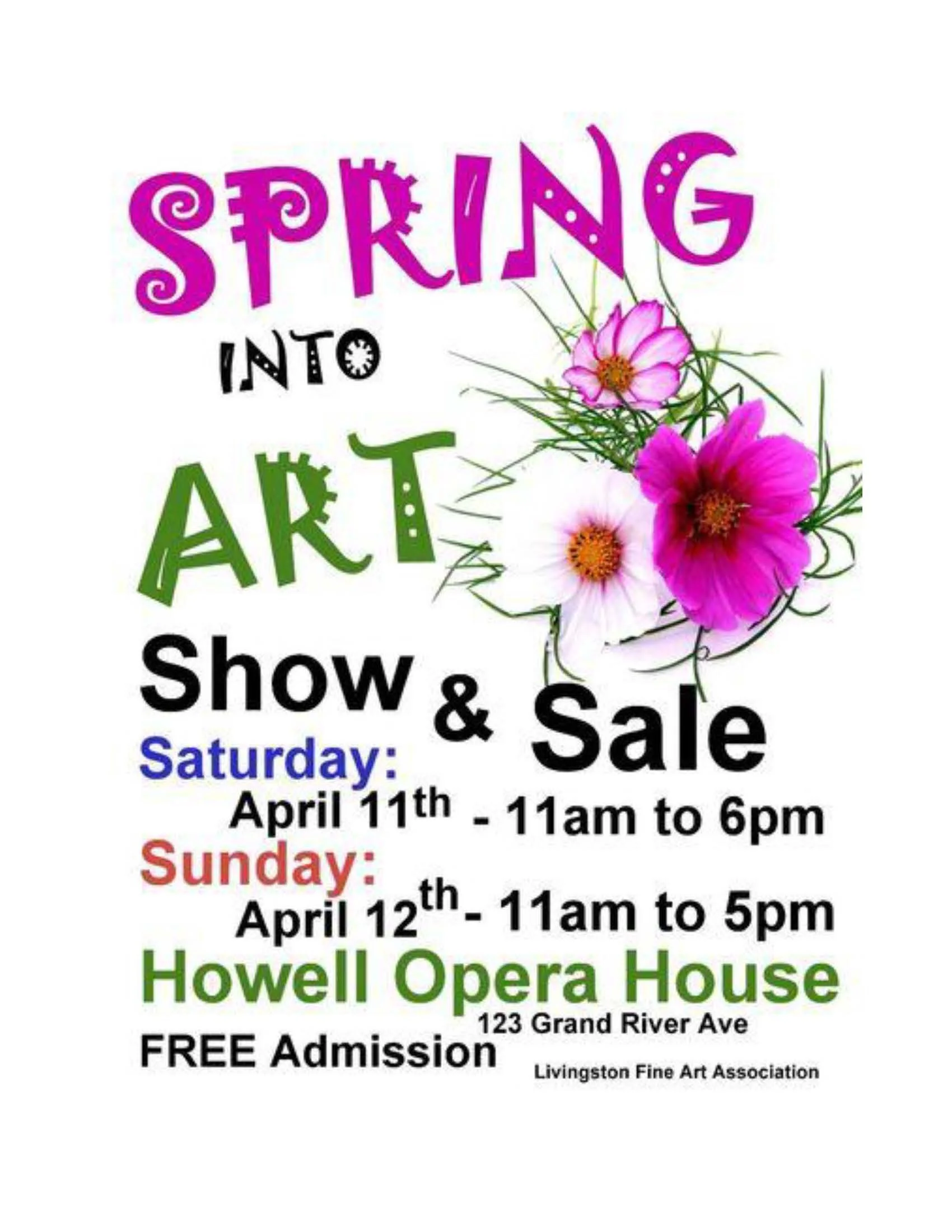 Back to All Events Spring into Art Sunday, April 12, 2026 11:00 AM 5:00 PM Howell Opera House 123 West Grand River Road Howell, MI, 48843 United States (map) Google Calendar ICS